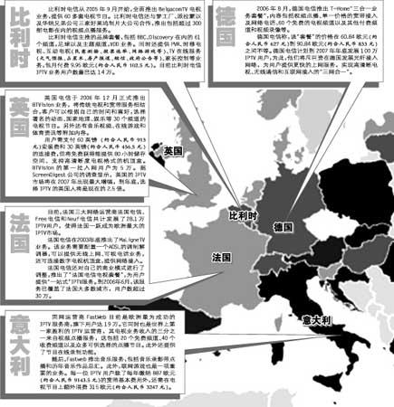 由于缺乏強(qiáng)大的衛(wèi)星網(wǎng)絡(luò)轉(zhuǎn)播、直播系統(tǒng),歐洲人是全球最早進(jìn)入IPTV時(shí)代的地區(qū)。如今,飽受傳統(tǒng)市場(chǎng)萎縮之苦的歐洲電信運(yùn)營(yíng)商,希望通過(guò)推出“三合一”式的網(wǎng)上音頻、視頻服務(wù),開(kāi)創(chuàng)全新的盈利局面。據(jù)悉,歐洲目前大約有65.8萬(wàn)IPTV用戶,今年以來(lái)已增加66%,預(yù)計(jì)到今年底,增長(zhǎng)率將達(dá)到200%;而兩年后,歐洲將有870萬(wàn)IPTV用戶。