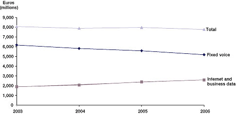 但問題是,在發(fā)達國家,用戶寬帶接入市場已經接近飽和。正因為是這樣一種情況,所以用戶數量也就很難再有增加。ARPU值在極大的競爭壓力下也很難有很大的突破。一切都靜止不動,固話收入持續(xù)下降,所以圖中的“'Internet