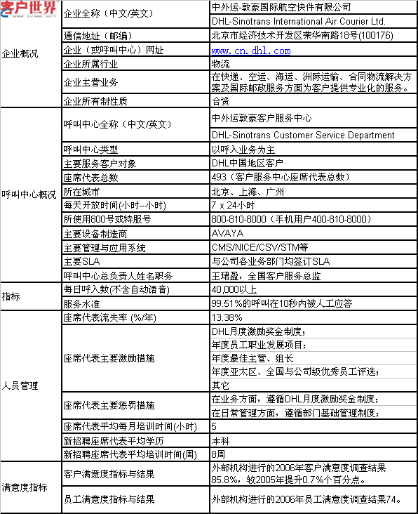 中外運敦豪客戶服務中心一直在逐步建立信息反饋機制和質量管理體系,從而確保服務不斷提升,實現(xiàn)和衡量客戶滿意效果。提供的服務有如下幾個特色:多渠道,通過多媒體客戶互動方式,讓客戶隨時隨地與客戶服務中心暢通聯(lián)系;一站式,通過客戶首次致電解決率和質量監(jiān)控,確保真正達到一站式服務;全天候,全年365天的不間斷熱線服務,確保每次聯(lián)絡都可以迅速理解客戶的需求,提供準確、詳盡的信息和解決方案;個性化,通過主動查詢、專人服務、快件保險等增值服務,讓全球客戶享受個性化解決方案;高績效,擁有經(jīng)驗豐富的管理團隊,應用標準規(guī)劃客戶服務中心發(fā)展方向和遠景,并通過流程控制、業(yè)務監(jiān)控等方式合理安排工作時間和人員配備,完成和保持DHL亞太區(qū)2003-2006年度的各項績效指標的領先地位;滿意度,為了確保在每一次聯(lián)絡中讓客戶滿意,經(jīng)過外部專業(yè)咨詢公司的年度客戶滿意度調查結果,中外運敦豪的客戶服務滿意度在物流業(yè)位居首位,公司還每兩年組織一次員工滿意度調查,并通過行動,吸引優(yōu)秀人才繼續(xù)和公司共同發(fā)展。