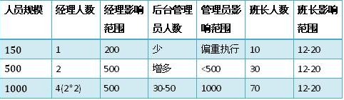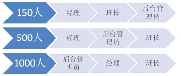 當(dāng)員工人數(shù)到達(dá)500人的時候,班長往往有30位左右。很多經(jīng)理已經(jīng)不能夠?qū)γ课话嚅L有足夠的了解,更不要說去認(rèn)識大部分員工。這個時候,經(jīng)理對班長的比例過寬,需要強化后臺管理員的角色。比如排班、績效、質(zhì)量管理(而不僅是評估)、信息分析(數(shù)據(jù)和報告)、行政、培訓(xùn)等工作中,這些管理輔助角色都在逐漸強化。而每一個后臺管理者可能成了經(jīng)理的直接下屬,他們起草的流程和制度,來由經(jīng)理決策。某種程度上說,他們比班長的影響力更大,因為班長還是影響著12-20人。有時候后臺管理員也決定了班長的時間精力分配,那是班長最寶貴的資源。那么誰是管理者呢?首先是經(jīng)理,其次是后臺管理員,最后才是班長。