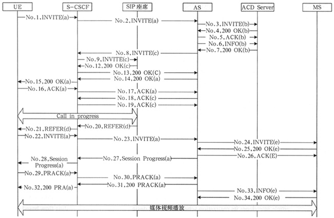 - No.33~34:AS根據(jù)用戶的相關(guān)信息去數(shù)據(jù)庫檢索所需媒體資源的文件名,并以INFO消息指示MS開始播放多媒體視頻;MS以200響應(yīng)收到的INFO消息,根據(jù)INFO消息中攜帶的媒體文件名去資源服務(wù)器中獲取該資源,并播放該多媒體資源。