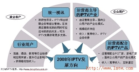 2008年,IPTV市場,因為發(fā)展速度明顯慢于了市場進度和技術(shù)演進。因此在原有的運營商產(chǎn)業(yè)化推動形勢下,終端廠家推動下的產(chǎn)品化發(fā)展模式也會得到更大的發(fā)展空間,而這在一定程度上雖會推動用戶對IPTV的認知度,同時也會分化一部分IPTV產(chǎn)業(yè)化的動力。