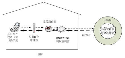 DoCoMo公司網(wǎng)里現(xiàn)有這類手機共37種),通過無線方式與免費IP包傳輸中繼器相連,免費IP包傳輸中繼器通過以太網(wǎng)經(jīng)過寬帶路由器或通過PPPoE(Point