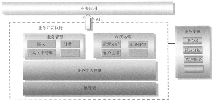 根據(jù)移動增值業(yè)務(wù)特征及業(yè)務(wù)部署、管理需求,目標(biāo)網(wǎng)絡(luò)架構(gòu)中將實現(xiàn)業(yè)務(wù)與控制的分離,劃分業(yè)務(wù)控制域和業(yè)務(wù)開發(fā)執(zhí)行域,并可開放公共接口實現(xiàn)各增值業(yè)務(wù)應(yīng)用無差別的接入、管理及功能調(diào)用,以方便的實現(xiàn)業(yè)務(wù)的融合、業(yè)務(wù)功能的靈活組合,更利于高效、簡便的實現(xiàn)業(yè)務(wù)部署、開發(fā)及運(yùn)營。