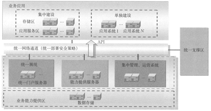 。4)應(yīng)用能力提供區(qū):統(tǒng)一建設(shè)業(yè)務(wù)應(yīng)用實現(xiàn)的基礎(chǔ)通道系統(tǒng)(包括業(yè)務(wù)能力提供系統(tǒng)、業(yè)務(wù)能力接口網(wǎng)關(guān)),并提供統(tǒng)一接口以實現(xiàn)業(yè)務(wù)應(yīng)用的靈活調(diào)用。
