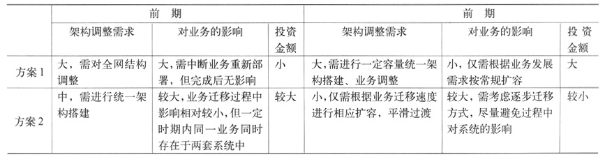根據(jù)網(wǎng)絡(luò)演進(jìn)架構(gòu)清晰度、實施難度、投資金額等綜合因素考慮,對以上方案分析對比如表1所示。