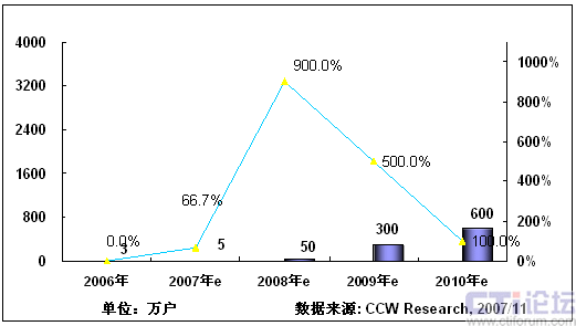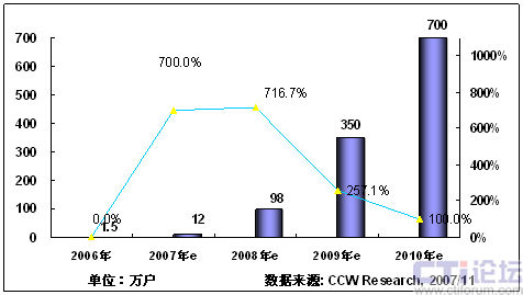 2008年,隨著3G在中國商用,以及奧運帶來豐富視頻內容,將推動手機電視作為一項重要的移動增值業(yè)務將進入市場發(fā)展期;同時隨著網(wǎng)絡、終端、內容、商業(yè)模式等因素的發(fā)展,產(chǎn)業(yè)鏈初步完善,看好手機電視業(yè)務的產(chǎn)業(yè)鏈各環(huán)節(jié)大力介入,北京奧運會將大大激發(fā)用戶使用手機電視業(yè)務的熱情,從而推動手機電視進入快速發(fā)展階段。根據(jù)計世資訊預計,2008年中國手機電視用戶將達到400萬。