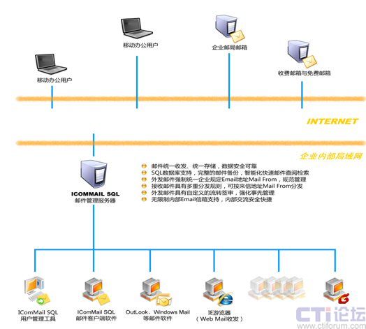 IComMail SQL企業(yè)郵件管理系統(tǒng)是?弟浖瞥龅膬(yōu)秀的郵件管理軟件,自2003年首推自今已有5年的發(fā)展歷史,系統(tǒng)設計先進、功能獨特完整、運行穩(wěn)定可靠,在國內(nèi)已有大批裝機用戶,其中以外貿(mào)、進出口等外向型企業(yè)為主要用戶群,廣大用戶已經(jīng)獲得了極大的受益。IComMail SQL系統(tǒng)主推的是其強大的郵件管理功能,與通常的郵件服務器Mail Server系統(tǒng)有著根本的區(qū)別,也有別于日趨流行的企業(yè)郵局服務,IComMail SQL系統(tǒng)是建立在通常的郵件服務器Mail Server或企業(yè)郵局的應用基礎上的,在企業(yè)局域網(wǎng)內(nèi)設立一IComMail郵件管理服務器,并采用穩(wěn)定可靠的SQL數(shù)據(jù)庫系統(tǒng)作為支撐,為企業(yè)建立安全可靠的企業(yè)郵件數(shù)據(jù)中心,并在此基礎上,擴展了很多高級的企業(yè)郵件管理功能,使企業(yè)的郵件應用水平有質(zhì)的提升。