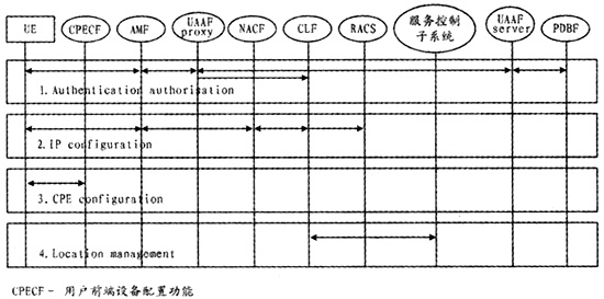 AMF負責翻譯UE的接入請求,將UE的IP地址分配請求以及網(wǎng)絡配置參數(shù)請求轉(zhuǎn)發(fā)至NACF,將用戶鑒權請求轉(zhuǎn)發(fā)給用戶接入鑒權功能(UAAF),反向則將來自NACF或UAAF的響應轉(zhuǎn)發(fā)給UE。