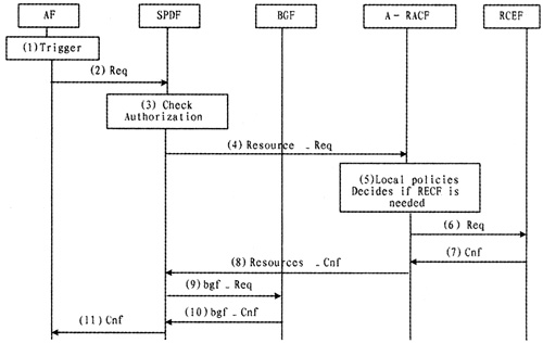 當收到來自SPDF的資源請求后,A-RACF便按照其事先從NASS收到的用戶接入清單進行鑒別。如果A-RACF核對從SPDF收到的QoS請求信息可以提供,即接受該請求,并且A-RACF在RCEF中加載該傳輸策略。RCEF實施A-RACF傳送過來的二層/三層媒體流策略,完成門控、QoS標記、帶寬限制等功能。如圖6即為AF請求資源時的具體消息流[7]。