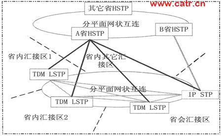 IP STP兼做L/HSTP。IP STP同時與B省HSTP開通B鏈路。省會匯接區(qū)到B省的省際長途業(yè)務(wù)直接通過IP