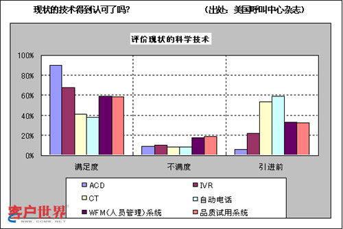 這是調(diào)查美國(guó)客服中心的管理者們?nèi)绾卧u(píng)價(jià)自己公司引進(jìn)技術(shù)的統(tǒng)計(jì)表。雖然“滿意”并不意味著“相關(guān)技術(shù)被有效利用”?墒菑恼{(diào)查結(jié)果來看,他們對(duì)技術(shù)的滿意度相當(dāng)高,并且看起來都在有效利用相關(guān)技術(shù)。