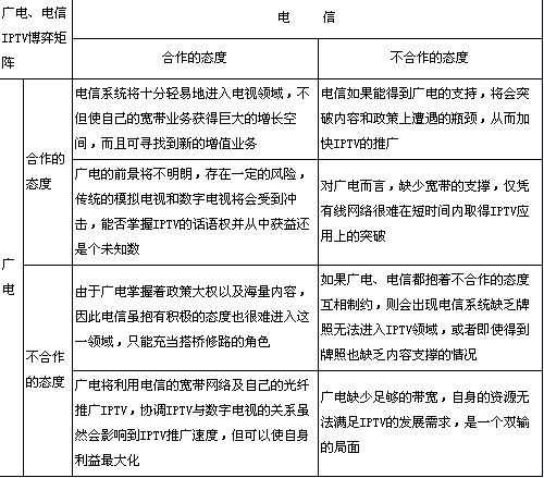 電信、廣電雖然都想爭(zhēng)奪IPTV的主導(dǎo)地位,但通過(guò)博弈矩陣可以看出,電信和廣電的互相滲透將是打造成熟的IPTV產(chǎn)業(yè)鏈的必然。廣電運(yùn)營(yíng)商具有內(nèi)容優(yōu)勢(shì),電信運(yùn)營(yíng)商擁有交互技術(shù)和網(wǎng)絡(luò)。廣電網(wǎng)絡(luò)的條塊分割決定了廣電運(yùn)營(yíng)商豐富的內(nèi)容資源一旦脫離了電信的IP網(wǎng)絡(luò),就很難抓住IPTV的機(jī)會(huì);而電信運(yùn)營(yíng)商的網(wǎng)絡(luò)資源沒(méi)有內(nèi)容,也會(huì)遭遇發(fā)展瓶頸,惟有廣電和電信合作競(jìng)爭(zhēng)才是IPTV產(chǎn)業(yè)走向健康發(fā)展的現(xiàn)實(shí)選擇。