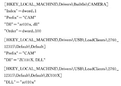 系統(tǒng)自動加載驅(qū)動程序時,首先要將驅(qū)動程序復制到\WINDOWS文件夾下,然后向注冊表中寫入攝像頭的驅(qū)動信息: