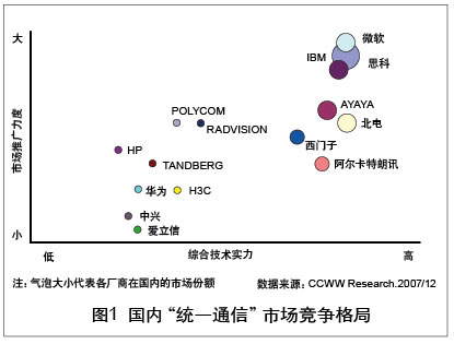 “統(tǒng)一通信”與傳統(tǒng)通信的根本區(qū)別在于不僅僅是網(wǎng)絡(luò)的融合,也是應(yīng)用的融合。從這個層面來看,“統(tǒng)一通信”真正帶給用戶的是成本的降低、工作效率的提升以及整個運(yùn)行機(jī)制的改變!敖y(tǒng)一通信”是以人性化為特征應(yīng)用層面的融合,這種融合囊括了更多的內(nèi)容、覆蓋更廣闊的領(lǐng)域、具有更大的力量,它使得通信產(chǎn)業(yè)與IT產(chǎn)業(yè),通信設(shè)備商、軟件廠商與電信運(yùn)營商之間的邊界越來越模糊,跨行業(yè)、跨領(lǐng)域的聯(lián)盟與合作成為開拓市場的必需。但隨著眾廠商的紛紛加入,多款“統(tǒng)一通信”產(chǎn)品及解決方案的推出,“統(tǒng)一通信”市場展現(xiàn)出了勃勃生機(jī)和巨大的成長潛力。在這些廠商中,有市場調(diào)研數(shù)據(jù)顯示思科市場份額領(lǐng)先,市場占有率高達(dá)35%。各類廠商之間既有競爭又有合作,但還沒有一個廠商占絕對優(yōu)勢。實際上,“統(tǒng)一通信”市場上的競爭者并不僅僅是這幾家巨頭,眾多網(wǎng)絡(luò)工具廠商、商用電話廠商也參與了這一競爭平臺。幾乎所有和ICT有關(guān)的巨頭廠商都集中在了這個領(lǐng)域,“統(tǒng)一通信”正進(jìn)入群雄爭霸的時代。國內(nèi)“統(tǒng)一通信”市場競爭格局如圖1所示。