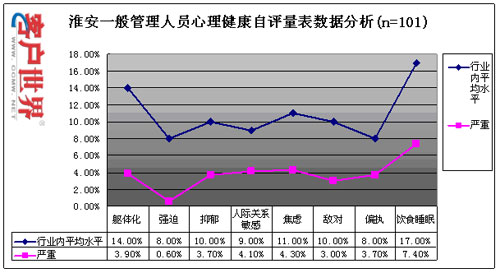 目前,員工壓力和心理健康情況已成為困擾整個(gè)行業(yè)的主要問(wèn)題之一,我們通過(guò)專業(yè)方法對(duì)淮安中心的員工心理健康和壓力狀況進(jìn)行了科學(xué)的測(cè)量,以了解該中心員工的壓力和心理健康狀況,具體測(cè)量數(shù)據(jù)如下: