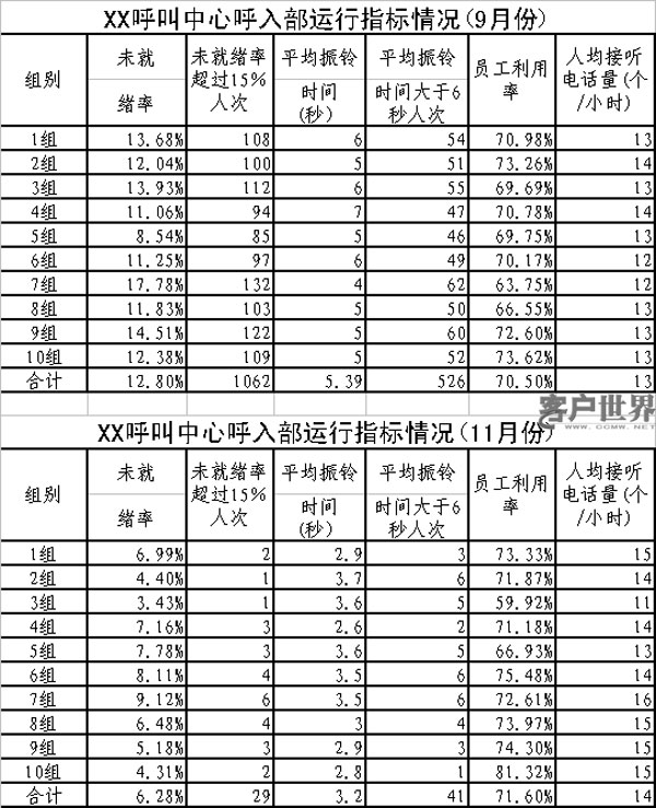 筆者所在呼叫中心從今年10月份開始實(shí)行“四率管理”,以解決現(xiàn)場管理工作的存在的問題,提高現(xiàn)場管理水平,提高服務(wù)效率。從統(tǒng)計(jì)數(shù)據(jù)看(見下表),實(shí)行“四率管理”后,呼叫中心的現(xiàn)場管理水平得到大幅提高,服務(wù)指標(biāo)增長較快。在員工利用率基本保持不變的情況下,未就緒率、平均振鈴時(shí)間、每小時(shí)接聽電話量等指標(biāo)均得到有效改善。其中,未就緒率從9月份的12.8%降低到6.3%,未就緒率低于15%的員工人次從1062次降低到29次;平均振鈴時(shí)間從5.4秒降低到3.2秒,平均振鈴時(shí)間大于6秒的人次從526人次降低到41人次。每小時(shí)人均接聽電話數(shù)量從13個(gè)提高到14個(gè)。按8小時(shí)工作計(jì)算,每人每天接聽電話數(shù)量增長10個(gè)左右。具體統(tǒng)計(jì)數(shù)據(jù)見下表。