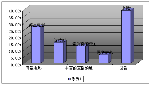 當(dāng)IPTV進(jìn)入家庭后,如何維系其可持續(xù)性,良性發(fā)展,便需要考慮用戶的使用心理,這個(gè)調(diào)查看出,內(nèi)容的豐富性和互動的優(yōu)勢是IPTV最為用戶稱道的地方,因此,在數(shù)字電視目前還主要以頻道數(shù)量和單向?yàn)橹鞯那闆r下,如何加大這方面的優(yōu)勢,將是IPTV的立身之本。
