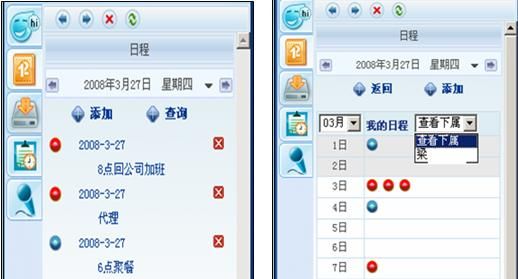 我們用過OUTLOOK的電子日程和手機自帶的日程功能都知道,電腦本機和手機實現(xiàn)日程管理都又各自很大的局限性,優(yōu)你客巧妙的實現(xiàn)了日程的網絡化管理并可以捆綁在手機提醒上,獨特又實用。其中紅綠日程各自代表工作和個人事務,其中工作日程還能共享給上級。