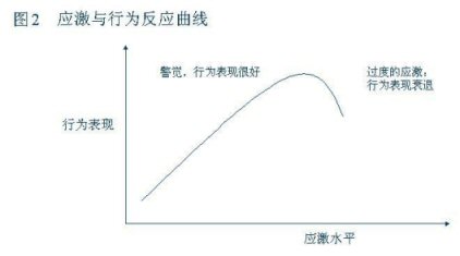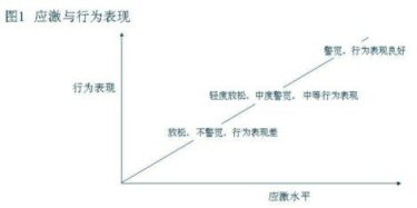 當應(yīng)激水平處于一個較低的指標時人在心理上處于一個放松、不警覺的狀態(tài),從而關(guān)聯(lián)的行為表現(xiàn)就比較差但隨著應(yīng)激水平的加大,相關(guān)聯(lián)的形為表現(xiàn)就會從中等向表現(xiàn)良好過渡。