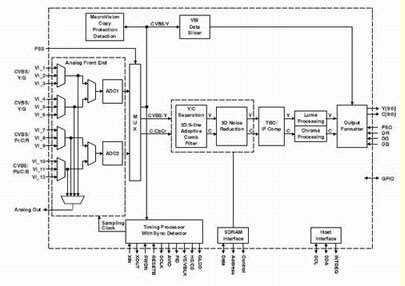 圖2所示為視頻解碼器的數(shù)據(jù)流路徑,它負責處理NTSC、PAL、SECAM、S-Video、SCART、YPbPr、RGB、480p和其它輸入格式。在數(shù)字電視中,對這種級別的靈活性的支持是必需的,完全是為了讓一個機型經(jīng)過實際設(shè)置可以工作于任何格式。數(shù)字電視解碼器的典型性能特征包括:同步、消隱、場、有源視頻窗口、水平和垂直同步、時鐘、同步鎖相(用于下行視頻編碼同步)、主CPU中斷和可編程邏輯I/O信號。這是對數(shù)字視頻輸出以及用于先進的垂直消隱期(VBI)數(shù)據(jù)恢復(fù)的補充。作為一種附加功能,一些視頻解碼器支持VBI數(shù)據(jù)處理器(VDP)在文字電視廣播、傳送字幕(CC)和其它VBI數(shù)據(jù)上進行數(shù)據(jù)分片、解析和執(zhí)行誤碼校驗。內(nèi)置的FIFO存儲多達11行文字電視廣播數(shù)據(jù),而適當?shù)闹鹘涌谕郊叭聊晃淖蛛娨晱V播恢復(fù)是當今系統(tǒng)中的幾個常見要求。然而,一些實現(xiàn)方案需要一種解碼器,它能夠為基于主CPU的VBI處理提供速度為已采樣原始亮度數(shù)據(jù)兩倍的輸出格式化數(shù)據(jù)。