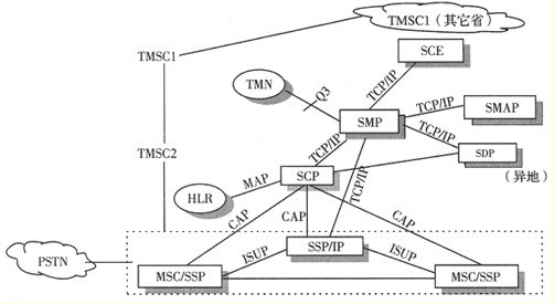 這是用戶進(jìn)入移動智能網(wǎng)的接入點(diǎn),與某交換局綜合在一起,IP設(shè)置于SSP中。它是一個交換機(jī),用來識別用戶的呼叫,把用戶的請求傳送給業(yè)務(wù)控制點(diǎn)。SSP可最初設(shè)在高等級交換局(長途局),逐步在匯接局和端局綜合設(shè)置。SSP的No.7信令軟件應(yīng)具備MTP、TUP或ISUP、SCCP、TCAP和INAP。
