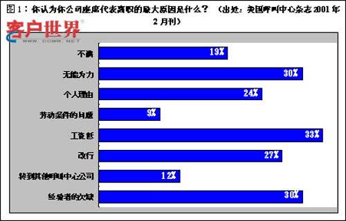 圖1是美國(guó)呼叫中心的調(diào)查結(jié)果。從顯示的結(jié)果來(lái)看,辭職的最大原因是工資低,其次是升職機(jī)會(huì)少。其中為了從事其他職業(yè)而辭職的占27%,要轉(zhuǎn)到別的客服中心工作的占12%。看到這個(gè)結(jié)果之后,發(fā)現(xiàn)即使在美國(guó),客服中心有關(guān)人員也沒(méi)有得到相應(yīng)的待遇。