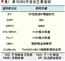 3GPP采用和其他標(biāo)準(zhǔn)化組織密切合作的方式制訂IMS技術(shù)標(biāo)準(zhǔn),并依靠各國(guó)通信界的協(xié)同不斷發(fā)展和完善(如表1所示)。其中,最重要的合作就是和IETF聯(lián)合開(kāi)發(fā)了IMS網(wǎng)絡(luò)的核心控制協(xié)議SIP[1],共同研究SIP的擴(kuò)展和應(yīng)用。另一個(gè)重要的合作是和Parlay組織聯(lián)合開(kāi)發(fā)了支持開(kāi)放式業(yè)務(wù)提供的Parlay/開(kāi)放業(yè)務(wù)接入(OSA)應(yīng)用程序接口(API),將源于固定智能網(wǎng)結(jié)構(gòu)開(kāi)放的Parlay技術(shù)引入IMS網(wǎng)絡(luò)的OSA結(jié)構(gòu)[2]。最重要的協(xié)同就是ETSI的TISPAN研究組和ITU-T提出了IMS中融入固定接入的技術(shù)[3],另一個(gè)重要的協(xié)同是OMA組織提出了許多基于IMS實(shí)現(xiàn)的業(yè)務(wù)規(guī)范和技術(shù)[4]。
