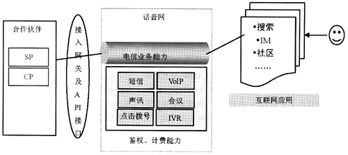 電信各種業(yè)務(wù)能力經(jīng)過封裝后以Web Services的方式向外開放,由互聯(lián)網(wǎng)應(yīng)用調(diào)用這些服務(wù)能力,提供基于互聯(lián)網(wǎng)的新型話音型業(yè)務(wù),互聯(lián)網(wǎng)應(yīng)用提供商作為SP與電信運(yùn)營商進(jìn)行收入分成,同時又有大量的CP作為新型話音應(yīng)用的內(nèi)容提供商加入價值鏈,運(yùn)營商在價值鏈上充當(dāng)主導(dǎo)作用。