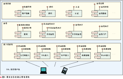 在圖1的網(wǎng)絡(luò)層次中,存在4種服務(wù)商角色:接入網(wǎng)提供商、業(yè)務(wù)網(wǎng)運(yùn)營商、業(yè)務(wù)提供商、聚合門戶網(wǎng)站。業(yè)務(wù)網(wǎng)運(yùn)營商可以在用戶簽約時(shí)提供多個(gè)業(yè)務(wù)提供者、聚合門戶網(wǎng)站的簽約選項(xiàng),用戶可以選擇在成為業(yè)務(wù)網(wǎng)運(yùn)營商的客戶的同時(shí)也成為多個(gè)感興趣的業(yè)務(wù)提供商的會員,后兩者可以訪問業(yè)務(wù)網(wǎng)運(yùn)營商的認(rèn)證、授權(quán)和計(jì)費(fèi)(AAA)基礎(chǔ)設(shè)施,從而對用戶身份進(jìn)行統(tǒng)一的認(rèn)證、授權(quán)和計(jì)費(fèi)。業(yè)務(wù)提供商和業(yè)務(wù)網(wǎng)運(yùn)營商之間的劃分可以采用結(jié)算制也可以采用批發(fā)業(yè)務(wù)的方式。