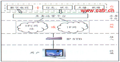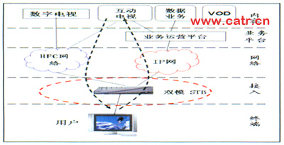 這種模式的合作點(diǎn)主要在接入層面,以提供雙模機(jī)頂盒為主要方法。固網(wǎng)公司和廣電發(fā)揮各自資源優(yōu)勢(shì)進(jìn)行合作。廣電節(jié)目傳送由廣電負(fù)責(zé),同網(wǎng)提供寬帶增值服務(wù),兩者分業(yè)經(jīng)營(yíng),地位平等。