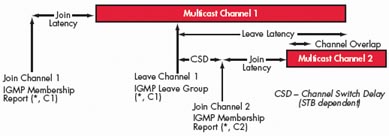 TV節(jié)目通常采用組播方式進行傳送。組播是一種允許一個或多個發(fā)送者(組播源)一次同時發(fā)送單一的數(shù)據(jù)包到多個接收者的網(wǎng)絡(luò)技術(shù)。組播源把數(shù)據(jù)包發(fā)送到特定組播組,而只有屬于該組播組的地址才能接收到數(shù)據(jù)包。在IPTV里,組播源往往僅有一個,即使用戶數(shù)量成倍增長,主干帶寬也不需隨之增加,因為無論有多少個目標地址,在整個網(wǎng)絡(luò)的任何一條主干鏈路上只傳送單一視頻流,即所謂“一次發(fā)送,組內(nèi)廣播”。組播提高了數(shù)據(jù)傳送效率,減少了主干網(wǎng)出現(xiàn)擁塞的可能性。對于TV系統(tǒng)而言,其所能夠支持的用戶數(shù)目僅僅受到接入網(wǎng)絡(luò)能力的限制,與前端推送系統(tǒng)的推送能力無關(guān)。因此,TV業(yè)務(wù)性能的主要測試指標包括所推送的最大頻道數(shù)目、頻道平均帶寬、平均頻道切換時間、I幀加入延時、平均頻道離開延時、平均頻道加入延時、頻道重疊時間和頻道間隔時間。