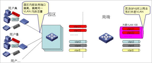 考慮到業(yè)務(wù)特性,上網(wǎng)業(yè)務(wù)通常需要對(duì)用戶進(jìn)行精細(xì)化管理,而對(duì)IPTV業(yè)務(wù)通常采用較粗獷的管理模式,因此我們建議通過如下方式來做VLAN規(guī)劃:對(duì)上網(wǎng)業(yè)務(wù),采用PUPV(每用戶一VLAN),對(duì)于IPTV/VOIP業(yè)務(wù),采用PSPV(每業(yè)務(wù)一VLAN),即同一園區(qū)內(nèi)的IPTV用戶采用同一VLAN,不同園區(qū)的IPTV/VOIP用戶采用不同的業(yè)務(wù)VLAN,在局端,通過靈活QINQ對(duì)上網(wǎng)業(yè)務(wù)的VLAN打外層標(biāo)簽,對(duì)于IPTV業(yè)務(wù)的VLAN不打外層標(biāo)簽。