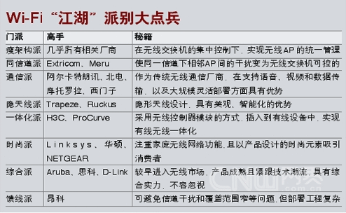 少林、武當(dāng)、華山、峨嵋、丐幫……眾多門(mén)派共同支撐起了武俠小說(shuō)當(dāng)中的“江湖”。而在無(wú)線網(wǎng)絡(luò)的“江湖”上,其實(shí)也存在著很多門(mén)派:比如瘦架構(gòu)派、同信道派、一體化派、通信派、隱天線派、時(shí)尚派等,各家廠商都有自己的看家本事,在極大豐富了無(wú)線產(chǎn)品,更好滿足了用戶需求的同時(shí),也促進(jìn)了無(wú)線技術(shù)在多個(gè)層面上的深入發(fā)展。
