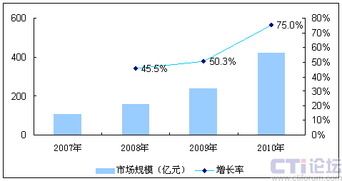 圖2 2008-2010年中國移動(dòng)互聯(lián)網(wǎng)市場規(guī)模預(yù)測