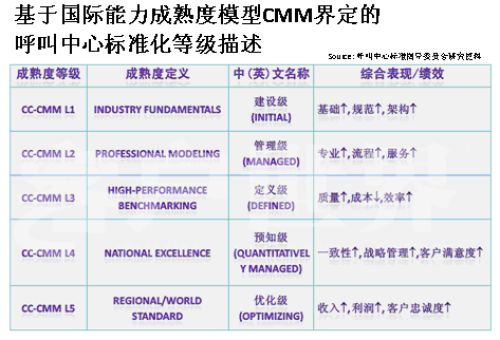 Markets)呼叫中心產(chǎn)業(yè)深入研究相結(jié)合的成果。。我在前幾年企業(yè)實(shí)施標(biāo)準(zhǔn)的時(shí)候深入研究了這套模型,這套模型對(duì)我們呼叫中心產(chǎn)業(yè)有極大的適用性,幾乎每個(gè)呼叫中心都可以在這套模型找到定位,從一個(gè)渾沌的初始過(guò)程到管理者,如果能夠建設(shè)一個(gè)持續(xù)的管控的流程到定義級(jí),如何進(jìn)行一致化管理,再到預(yù)知級(jí),幾乎每個(gè)呼叫中心從大到小,從年輕到發(fā)展一段時(shí)間都可以找到自己的定位,所以我們?cè)谠瓉?lái)的信息產(chǎn)業(yè)指導(dǎo)委員會(huì)的支持下,我們重新結(jié)合CMM模型開(kāi)發(fā)出了符合我們呼叫中心發(fā)展的一個(gè)標(biāo)準(zhǔn),我建議大家把它看成是一個(gè)模型,整個(gè)國(guó)際產(chǎn)業(yè)都定性了標(biāo)準(zhǔn),因?yàn)榇蠹叶贾繡MM模型是一個(gè)開(kāi)放性的知識(shí)體系,并不是一個(gè)封閉標(biāo)準(zhǔn)。CMM模型,首先你的呼叫中心建設(shè)要能夠符合呼叫中心的定義,不是找?guī)着_(tái)話(huà)機(jī)或?qū)ν庥袀(gè)一個(gè)客服號(hào)碼對(duì)外就能稱(chēng)為呼叫中心。