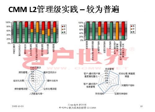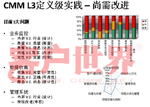 接下來(lái)我用一個(gè)很小的案例結(jié)束今天的分享,我們整個(gè)的呼叫中心的成熟度模型目前是在電信行業(yè)開(kāi)始了2008年版的推廣,成熟度模型經(jīng)歷從07年成立亞太呼叫中心產(chǎn)業(yè)聯(lián)盟以后,由一群這個(gè)行業(yè)里面的專(zhuān)家,特別是中國(guó)產(chǎn)業(yè)市場(chǎng)的發(fā)展建立起的標(biāo)準(zhǔn),一年以來(lái)在通信行業(yè)我們做的能力成熟度的判定有一些很有意思的啟示,通信行業(yè)占到我們整個(gè)呼叫中心產(chǎn)業(yè)約70%的坐席,是最大的、最有代表性的產(chǎn)業(yè)。做下來(lái)真的很有代表性,普遍性在于環(huán)境建設(shè)、資產(chǎn)投入、資產(chǎn)配置,所以這下面的雷達(dá)就可以看到,相對(duì)完善都是在環(huán)境建設(shè),功能區(qū)建設(shè),整體空間設(shè)計(jì)、硬件相對(duì)來(lái)說(shuō)比較偏硬的一些。在其他方面偏廢的比較厲害。第二個(gè)雷達(dá)在一些獎(jiǎng)懲管理、信息管理,整個(gè)軟性方面幾乎有很濃重的一些計(jì)劃經(jīng)濟(jì),制造行業(yè)的一些領(lǐng)域相對(duì)來(lái)說(shuō)比較成熟。我們目前看到的,基本上通信行業(yè)的一些發(fā)展在能力成熟度上是二級(jí)到四級(jí),尤其以二到三級(jí)的發(fā)展更為普遍。通常的方法為期一周的標(biāo)桿調(diào)研,看所有的呼叫中心發(fā)展的五個(gè)方面,我們才會(huì)在里面做這樣的判定。在能力成熟度的三級(jí),我們做了一些企業(yè)發(fā)現(xiàn),特別在三級(jí),關(guān)于能不能對(duì)流程進(jìn)行一致性管理方面,就是剛才李老師講到的不是最急的,而管理是最重要的?赡芩械牧鞒潭喽嗌偕儆幸恍┏墒於鹊膯(wèn)題,但是我們的源頭流程能力在三個(gè)方面有很大的差距:一個(gè)是業(yè)務(wù)監(jiān)控流程,第二個(gè)數(shù)據(jù)收集流程,還有一個(gè)是管理系統(tǒng)的審核流程。這個(gè)大家可以和自己的呼叫中心比一比。