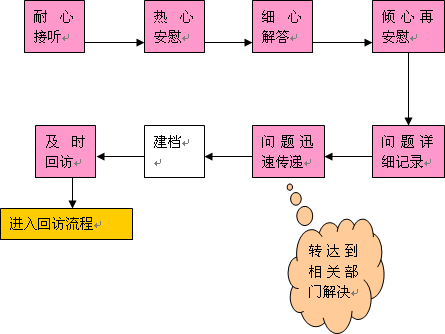 a、 呼叫中心在回訪、投訴應(yīng)答、咨詢應(yīng)答過(guò)程中存在的問(wèn)題,應(yīng)當(dāng)及時(shí)的轉(zhuǎn)遞到相關(guān)的部門。