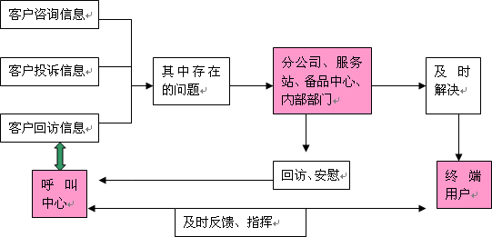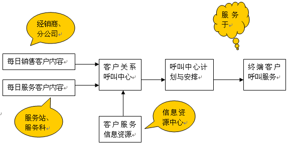 呼叫中心的回訪呼叫工作、咨詢服務(wù)呼叫和問(wèn)題投訴呼叫需要掌握大量的客戶信息資源和公司的產(chǎn)品與服務(wù)政策信息,而這方面的信息需要由客戶購(gòu)車過(guò)程、維修過(guò)程和公司內(nèi)部的相關(guān)部門提供。