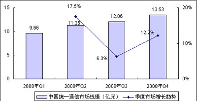 圖 1 2008年Q3中國統(tǒng)一通信整體市場規(guī)模