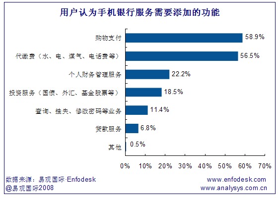 《2008年中國個人網(wǎng)上銀行市場用戶調(diào)研報告-手機銀行》研究發(fā)現(xiàn),用戶認為手機銀行需要添加的功能主要為購物支付和代繳費,分別占58.9%和56.5%。