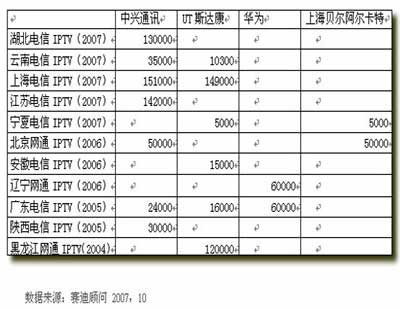 在IPTV設(shè)備供應(yīng)商中,各家廠商各有千秋,其中在國內(nèi)市場占有率最好的是中興通訊,其次是UT斯達(dá)康、華為、上海貝爾阿爾卡特。中興通訊跟華為均能提供端到端的解決方案,從頭端到客戶端,從業(yè)務(wù)層到傳輸層,提供完整的設(shè)備,可以使用統(tǒng)一的平臺對整個(gè)系統(tǒng)進(jìn)行管理,并且在保證統(tǒng)一的同還提供了較好的開放性,支持多家內(nèi)容提供商及STB的接入。