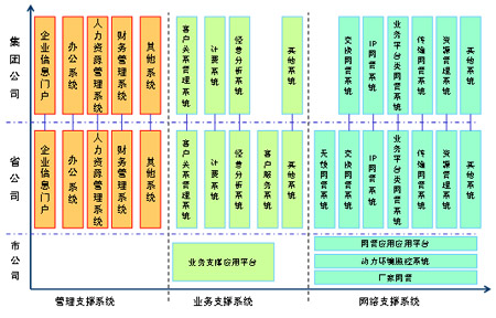 從系統(tǒng)的部署來(lái)看,主要集中在集團(tuán)與省公司,其中,集團(tuán)公司系統(tǒng)主要具備面向全公司的企業(yè)管理、經(jīng)營(yíng)分析等功能;省公司從以職能管理為主逐步轉(zhuǎn)變?yōu)橐陨a(chǎn)管理為主,具有了越來(lái)越多的生產(chǎn)職能,在運(yùn)營(yíng)支撐系統(tǒng)建設(shè)中的作用更加突出;市公司的生產(chǎn)管理職能有所削弱,將主要負(fù)責(zé)市場(chǎng)的具體營(yíng)銷、客戶支撐以及設(shè)備的現(xiàn)場(chǎng)維護(hù)等工作,F(xiàn)有系統(tǒng)主要存在以下幾個(gè)問(wèn)題: