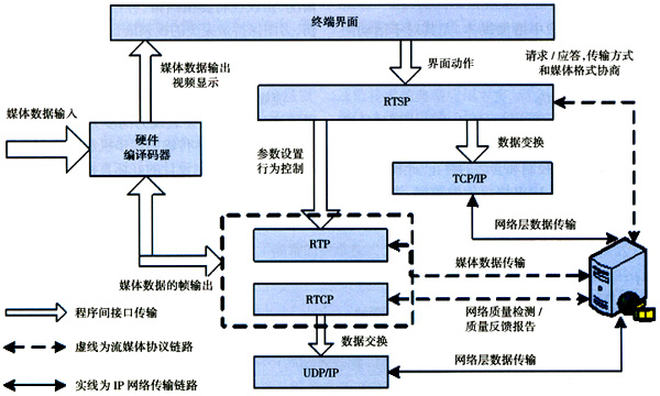 RTP/RTCP模塊是以客戶端為主的應用傳輸模塊。主要內容包括:RTP/RTCP協議棧的會話的建立,會話的傳輸,會話的控制和會話的終止。此模塊位于TCP/IP層之上,使用UDP協議傳輸數據。當應用程序開始一個RTP會話時通常使用兩個端口:一個給RTP,一個給RTCP。在RTP會話期間,各參與者周期性地傳送RTCP包。RTCP包中含有已發(fā)送的數據包的數量、丟失的數據包的數量等統計資料,因此,服務器可以利用這些信息動態(tài)地改變傳輸速率,甚至改變有效載荷類型。RTP的媒體數據載荷加載準則依賴于不同的媒體編碼格式而不同,數據報文的格式按照RFC規(guī)定的實現。