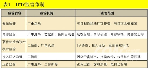 根據(jù)國(guó)務(wù)院直屬部委機(jī)構(gòu)的職能劃分,國(guó)家將信息產(chǎn)業(yè)、廣播電影電視產(chǎn)業(yè)分別交給工信部和國(guó)家廣電總局管理。由表1可以看出,在IPTV的監(jiān)管方面,國(guó)家廣電總局起著舉足輕重的作用,尤其是關(guān)于節(jié)目制作和運(yùn)營(yíng)方面的監(jiān)管,對(duì)IPTV的發(fā)展影響重大,隨時(shí)都有可能出臺(tái)新的規(guī)定,影響整個(gè)IPTV的發(fā)展。