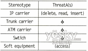 針對圖1中定義的定型以及對網(wǎng)絡(luò)安全構(gòu)成威脅的攻擊者的類型,可以定義出威脅函數(shù)TheatA(s)。其中A表示攻擊者類型,這里假定攻擊者為具備一般能力的外部攻擊者,即其可以竊聽到廣播信道上的數(shù)據(jù)流量,并可以插入或刪除數(shù)據(jù)流量,能夠利用系統(tǒng)漏洞入侵系統(tǒng);表示為模型中定義的定型威脅函數(shù)的值域為{delete,read,insert,access}。根據(jù)NGN中承載網(wǎng)絡(luò)和計算節(jié)點的特性,我們可以得出如下威脅函數(shù),如表1所示。