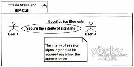 下面以基于SIP的兩方會話為例說明如何使用UMLsec描述業(yè)務(wù)安全需求。假定兩方呼叫發(fā)生在同一SIPProxy轄域的兩個用戶之間,要求保證用戶UA與SIPProxy之間的信令的完整性,不能被非法入侵者篡改。該場景的用例圖和部署圖分別如圖2、圖3所示。
