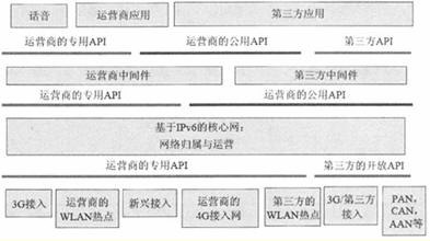 在某種意義上,下一代網絡必須是一種可編程的、基于IP的網絡,這必然要求XG為應用開發(fā)提供強大的、方便的、定義明確的API。對于一些業(yè)務提供商來說,API思想本身并非僅僅是一個基本概念。目前,公共API是指所有第三方都可用的API,它包括標準的、開放的API子集。另一方面,專用API是指由某個公司控制、僅僅在公司內部或合作伙伴內部可用的API。圖1給出了下一代網絡API體系結構的一種高級分類方法。