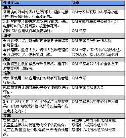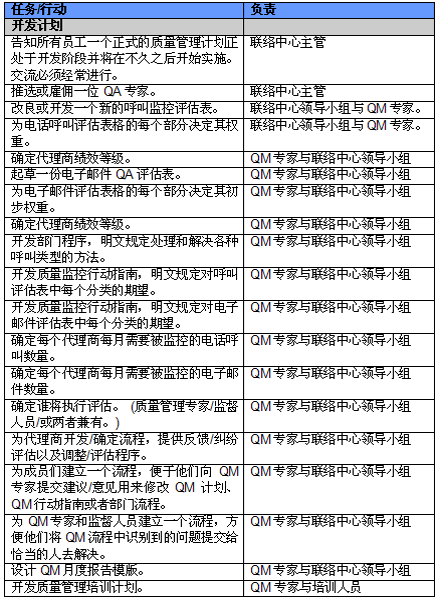 4. 開展項目交流。管理人員必須就新的或者修繕后的QM計劃與代理商進行交流。QM的成功與否與代理商的合作密不可分,如果代理商受邀參與新QM計劃的開發(fā)并且所有改變都在雙方之間明確交流過,那么成功的機會也將大大提高。交流的內容應包括為什么要開發(fā)這樣一個計劃,它的作用和職責是什么,它對代理商會產生哪些影響(對于他們的評估和提升)以及它能帶來哪些好處。幫助代理商認識到QM計劃積極的一面很重要,因為只有這樣才能讓他們看到QM不僅僅是管理人員用來告訴他們做錯了事情的一種手段。讓聯(lián)絡中心全體員工參與QM計劃的開發(fā)能夠建立他們對該計劃的支持,提高接受度的同時避免不知所措。這對聯(lián)絡中心剛剛嶄露頭角,QM計劃還未全面鋪開的中國市場而言尤為重要。