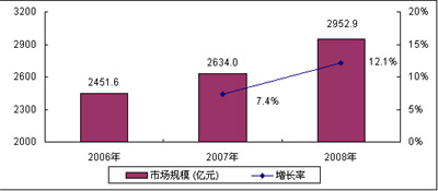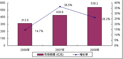 圖3 2006-2008年中國通信設(shè)備市場(chǎng)規(guī)模及增長